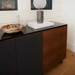 Create an effortlessly cool, contemporary space with the soft tones of our Augustus Sideboard. Featuring a simple warm walnut veneer, delicate gold detailing, and modern dark cabinet fronts; the Augustus will add a touch of timeless elegance to any space.