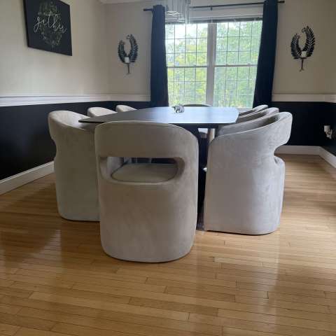 The Rhea Dining Chair exudes pure sophistication with its curved form and sumptuous upholstery. Its graceful silhouette and luxurious design bring modern elegance to any dining space.